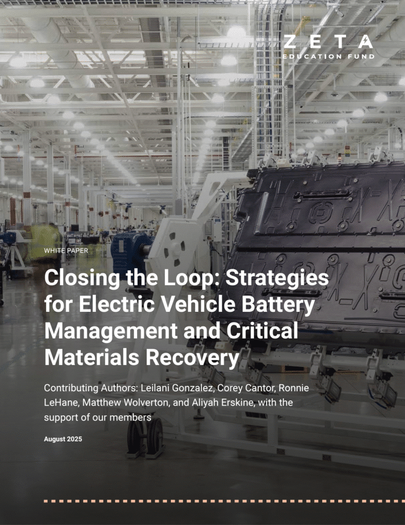 ZETA released a new whitepaper in August 2025, titled Closing the Loop: Strategies for Electric Vehicle Battery Management and Critical Materials Recovery. Contributing Authors Leilani Gonzalez, Corey Cantor, Ronnie LeHane, Matthew Wolverton, and Aliyah Erskine collaborated, with the support of ZETA members.