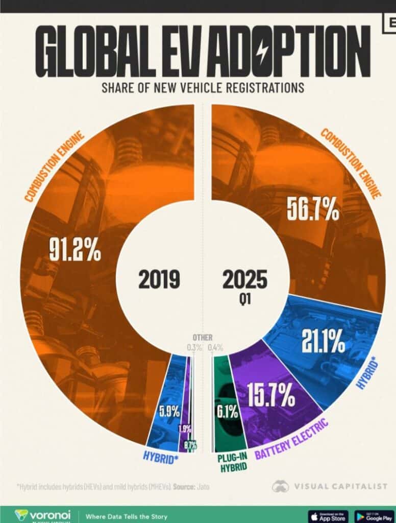 Visual Capitalist and JATO reported that electrified vehicles now make up 43% of global auto sales as of Q1 2025, up from just 9% in 2019. China accounts for more than half of global BEV sales, with Europe and the U.S. trailing far behind.