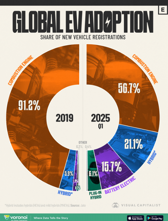 The global auto market has reached a historic tipping point: electrified vehicles now represent 43% of all new car sales worldwide as of Q1 2025, according to the latest industry data from JATO, reported by Visual Capitalist. That’s a remarkable leap from just 9% in 2019, underscoring the rapid acceleration of the transition away from internal combustion engines.