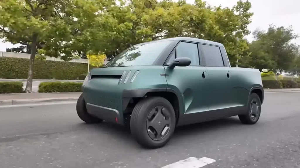 Unlike many of today’s large electric pickups (like Ford’s F-150 Lightning or the Rivian R1T), the MT1 is small and affordable, more comparable to compact Japanese kei trucks adapted for the U.S. It’s just 152 inches in length (about the size of a two-door Mini Cooper), yet still carries five passengers and includes a five-foot bed. Unique design touches include a cargo tunnel behind the rear seats (inspired by Rivian’s “gear tunnel”) and a folding midgate for carrying longer items like surfboards.