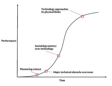 The S-curve of technology diffusion describes how new technologies typically move from slow initial adoption, to rapid exponential growth, and eventually to saturation as markets mature. Early uptake is often constrained by high costs, limited infrastructure, and uncertainty, but once key thresholds are crossed, such as cost competitiveness, scalability, and social acceptance, adoption accelerates quickly through self-reinforcing feedback loops.