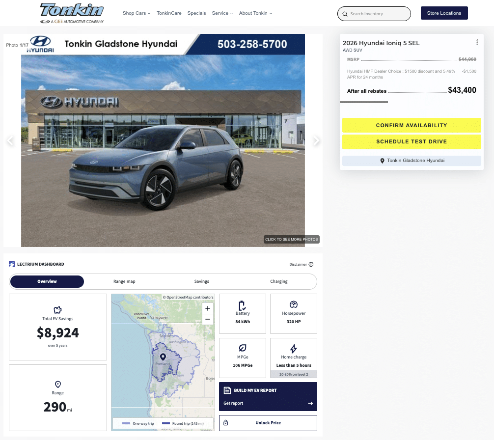 The Electrified Dashboard consolidates key vehicle details – range, charging specs, fuel economy, and savings calculations – so shoppers can make confident decisions without hunting through multiple sources.