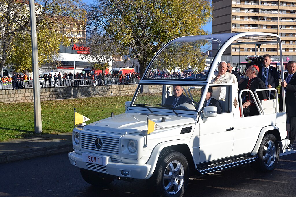 In this photo, Pope Francis, was seen in the Mercedes EV Popemobile in December 2024 in Corsica, an island in the Mediterranean Sea, located southeast of mainland France and west of Italy.